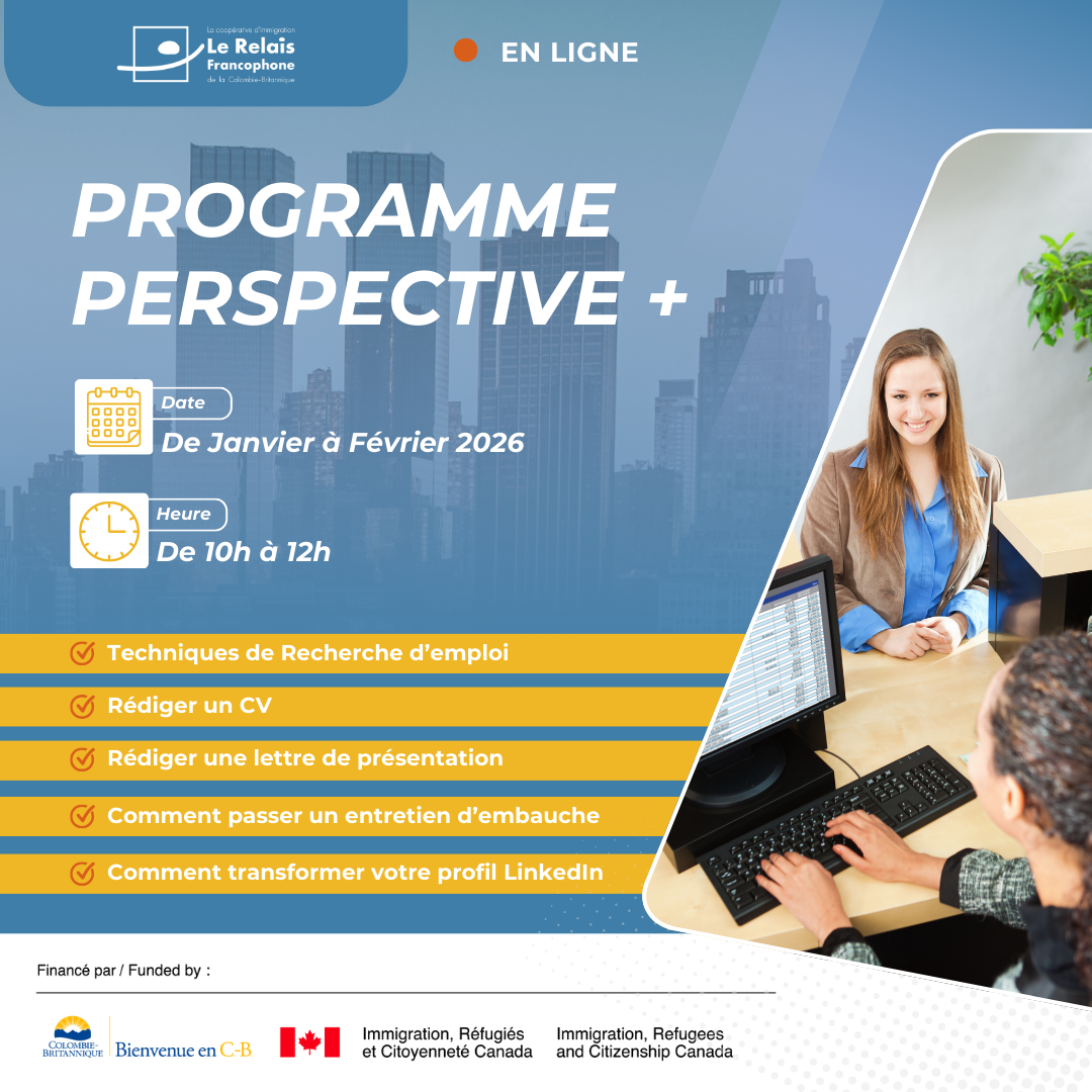 Le Relais Francophone vous présente Perspective +, un programme complet en 5 ateliers pour développer vos compétences, comprendre les attentes des employeurs et maximiser vos chances de décrocher un job durable en C.-B.